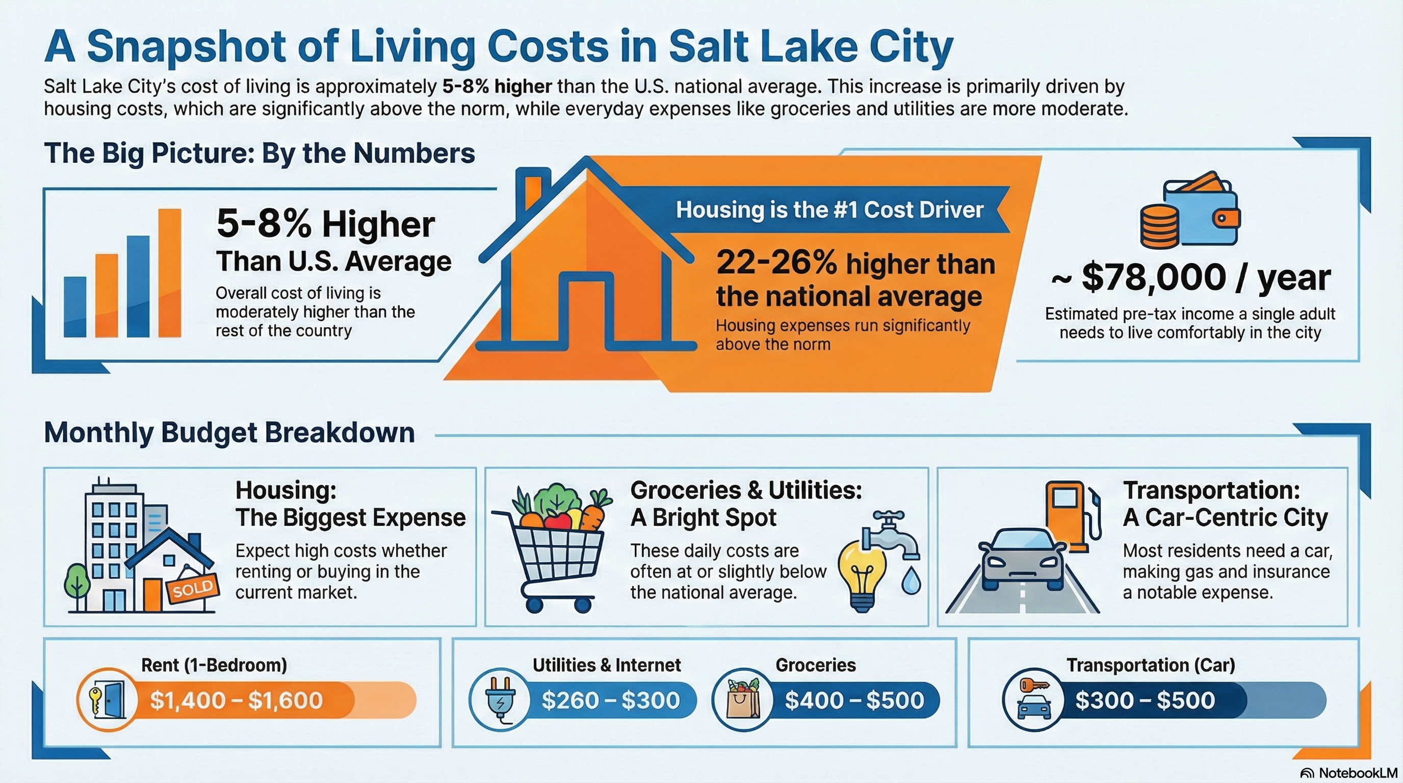 Living in Salt Lake City now costs a bit more than the national average, and housing is the main reason why. Overall cost-of-living calculators put Salt Lake City roughly 5–8% higher than the U.S. average, with housing running about 22–26% higher than typical.
