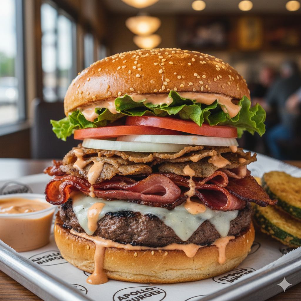 The Utah burger has a juicy beef patty with smoked pastrami, bacon, gyro meat, American cheese, fresh vegetables, and their signature Apollo Sauce on a cornmeal bun, delivering a rich, Greek-influenced spin on Utah’s beloved pastrami burger.