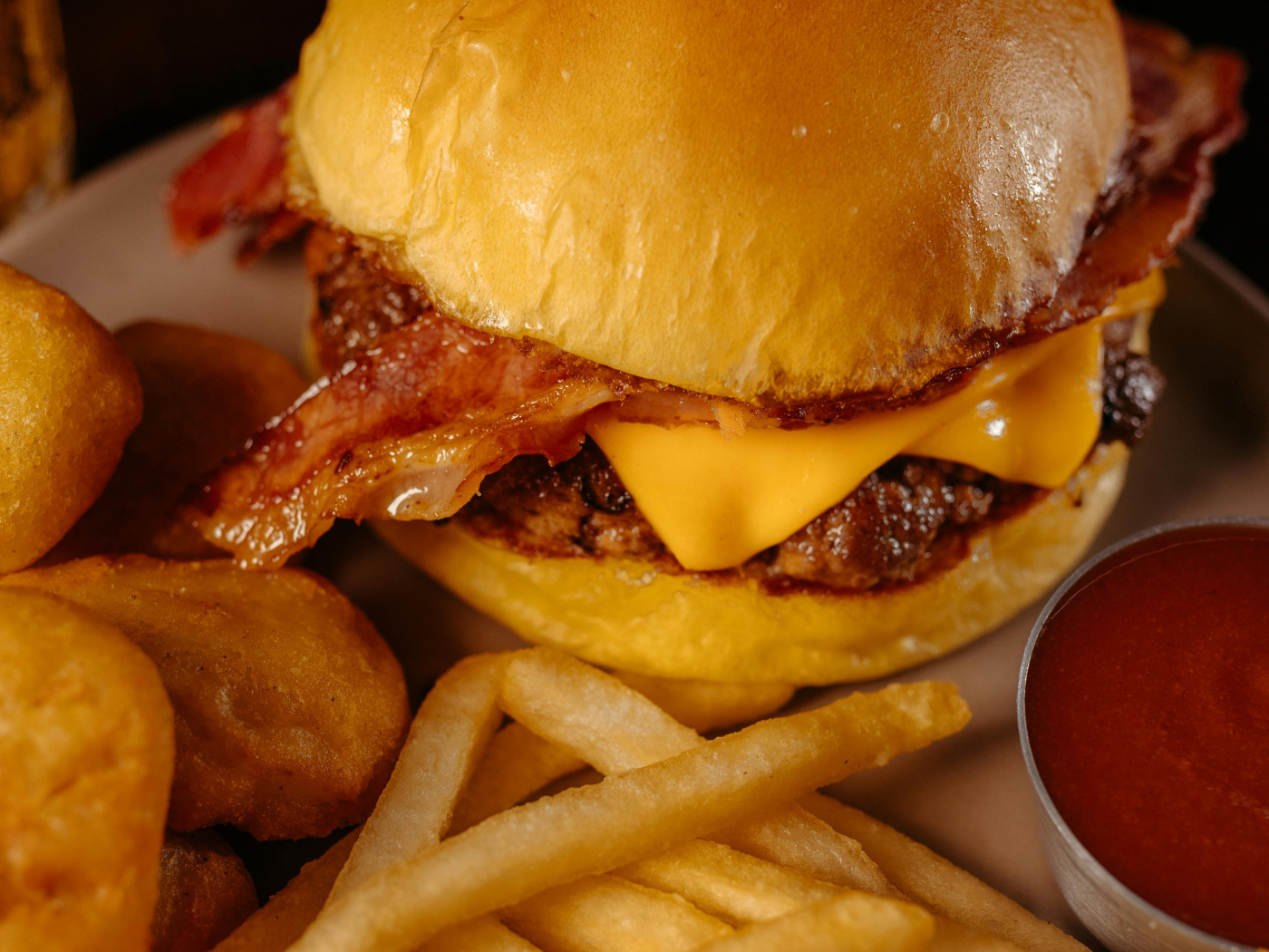 Recommended: The California Burger—topped with bacon, avocado, and Swiss for a fresh, creamy finish.